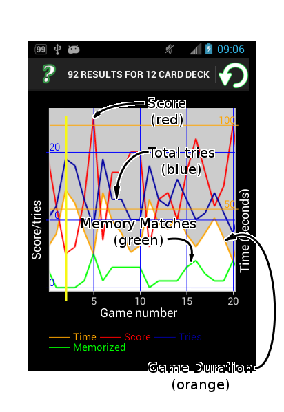 The color key at the bottom of the graph tells the meaning of the lines on the graph. Note that the 3 on the left are score or number and those on the right are seconds. Score is indicated in points and memory-match and tries are the number. Game duration is seconds.